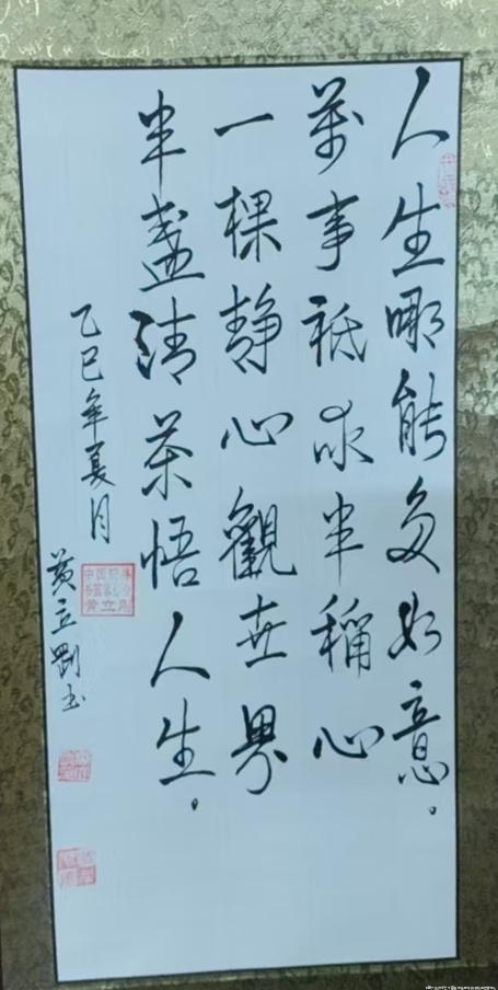 黄立刚,湖南湘西人,于1981年-1992年在家乡教书,小学教师;1993年至今在广州打工,做过平安保险业务员,酒店物业管理,现年62岁在广州市接送孙子,孙女上下学。从小便热爱书法,坚持每天练习书法,经常向书法老师,同行,请教。书法是我生活里的一抹亮色,每当提笔,墨香萦怀,仿佛与古人对话。以热爱为笔,饱蘸坚持的墨,一笔一划,书写对书法的虔诚,一步步向这门古老艺术的深邃处探寻,不负热爱,不负时光 。