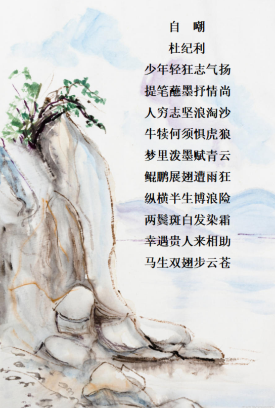 特约艺术家 杜纪利 数十载人生流转,始终以诗词绘画为心灵归处。笔端偏爱截取自然日常的切片 —— 白杨飞絮、春草探头、飞鸟啁啾皆可入题,文字如未经雕琢的溪流,直白中藏着灵动。那份少年时的热忱从未褪色,写 “逐风流” 时意气飞扬,谈 “寻常道” 时澄澈通透,于天真漫谈里藏生活感悟,在草木山川中悟人生真味,让每首诗、每幅画都带着泥土的温度与星光的亮。