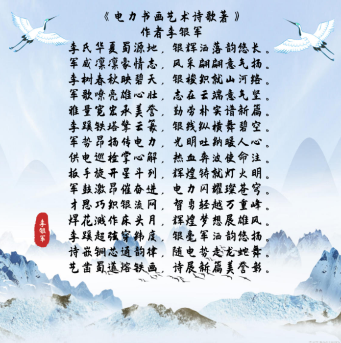 《祖国75 华诞国庆风彩》和《河口供电所情系万家灯火》在全国书画大赛墨缘杯获得特等奖;《中秋团圆赏明月》、《清明扫慕寄相思》和《七律诗韵》在全国书画艺术大赛墨缘杯获得一等奖;《龙源电力龙潭情》在全国诗词大赛函夏系列墨缘杯获得一等奖。《小雪时节》和《呤冬至》在全国书画诗词大地杯艺术比赛获得三等奖;《观乐山大佛》在全国书画大地杯艺术比赛获得三等奖。《抗美援朝长津湖战役纪念日》在全国书画大赛翰墨杯获得特等奖;《2025四月你好》在翰墨杯全国书画艺术大赛获得金奖;《赞三峡售票员小赵》在全国书画艺术大赛翰墨杯获得三等奖。《醉美达州欢迎您》在盛世华章文学奖获得金奖作品,《赞前进中的四川能投万源龙源电力》获得优秀作品。《电力诗画艺术诗歌著》全国书画艺术大赛韶华杯获得特等奖。《高考加油》和《祝福父亲节快乐》在书韵杯全国书画大赛获得特等奖。《红颜知己》在全国书画诗词大赛获得耀华文学奖、《早安吉祥》获得优秀奖。《澳门回归25周年庆》在墨韵东方杯获得一等奖。《国家 4A八台山风景区》在第十五届“风雅古韵”杯全国诗词文化大赛获得优秀奖。《梦回大唐》在兰亭杯获得金奖。《电力乡情》在澜轩杯全国书画大赛获得三等奖。《巴山万源富硒地》在第二届盛世长歌中华诗词创作大赛获得铜奖。从电力工匠到文化创作者,借诗词书画绘就家国情怀,以传承之志书写文化担当,在中华民族五千年诗词文化长河中,原为复兴路上的“文化提渡 ,以艺术之笔绘画时代蓝图。