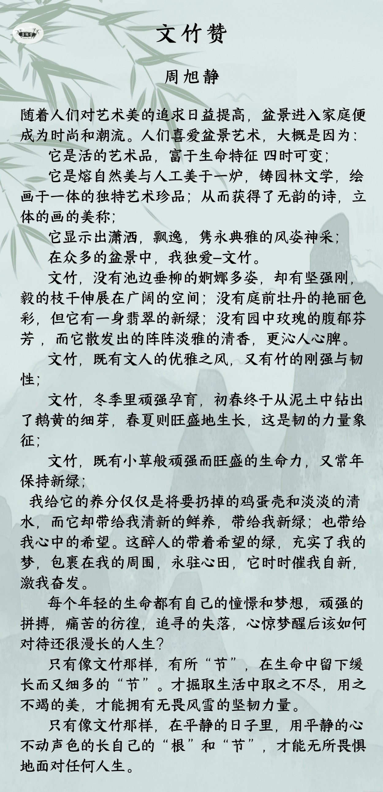 周旭静 平台特约艺术家(ZCTY000088142HB)爱党爱国,真诚善良,刻苦勤劳。心中充满梦想激情。高中毕业后就职国营化工企业。业余时间了解保险行业,同时坚持自学汉语言文学专业,退休前拿到文凭。